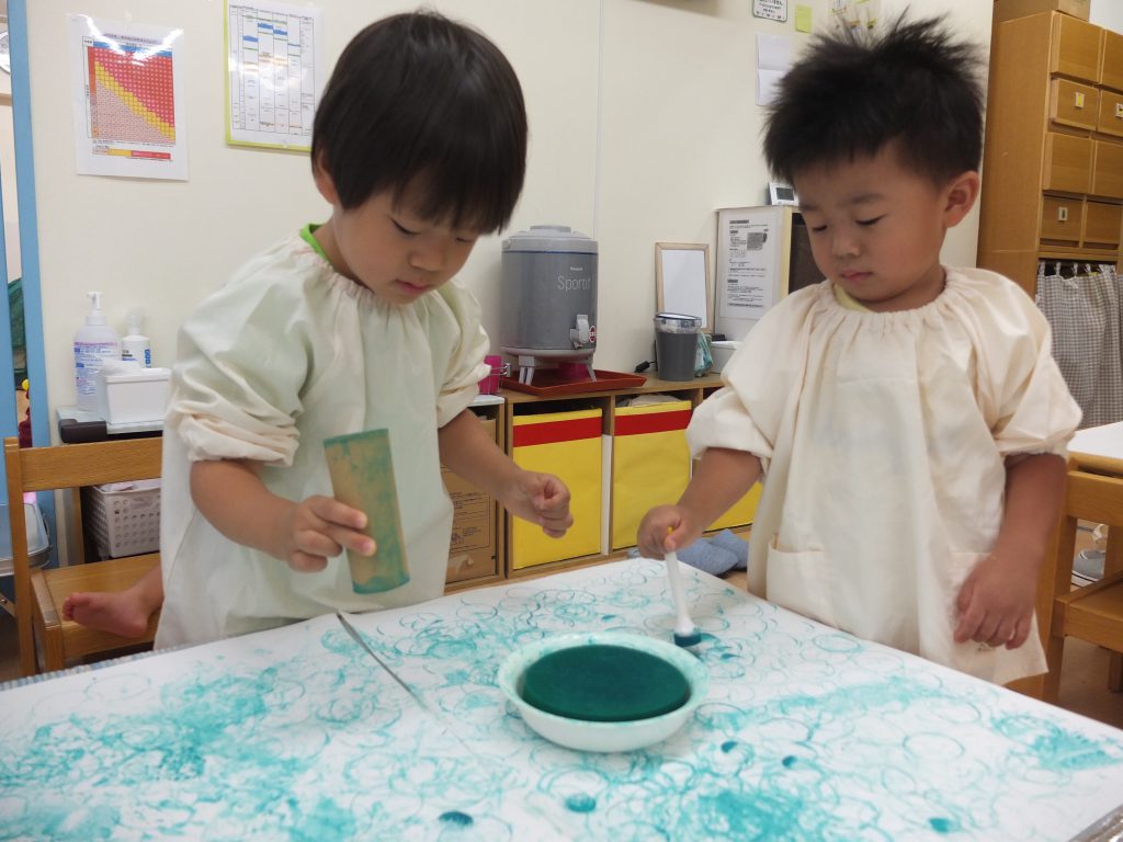 少し前のお話になりますが雨が続いたある日、担任が用意した絵の具といろんなスタンプ道具を使って大きな紙に自由にスタンプ遊びをして壁に飾りました。