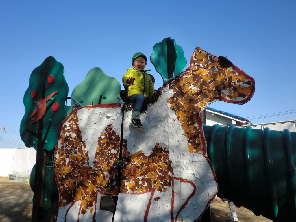 さて、玄関にいたコロンちゃんがお外に遊びに来ていました。コロンちゃんの背中の部分がちょうど固定遊具の柵の高さと一緒だったそうで踊り場になっている反対側に台を置き、その上に座って乗馬体験をしました。