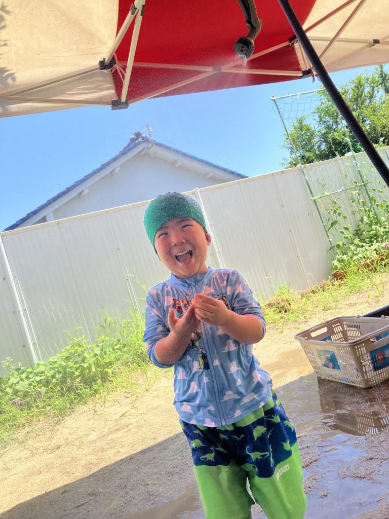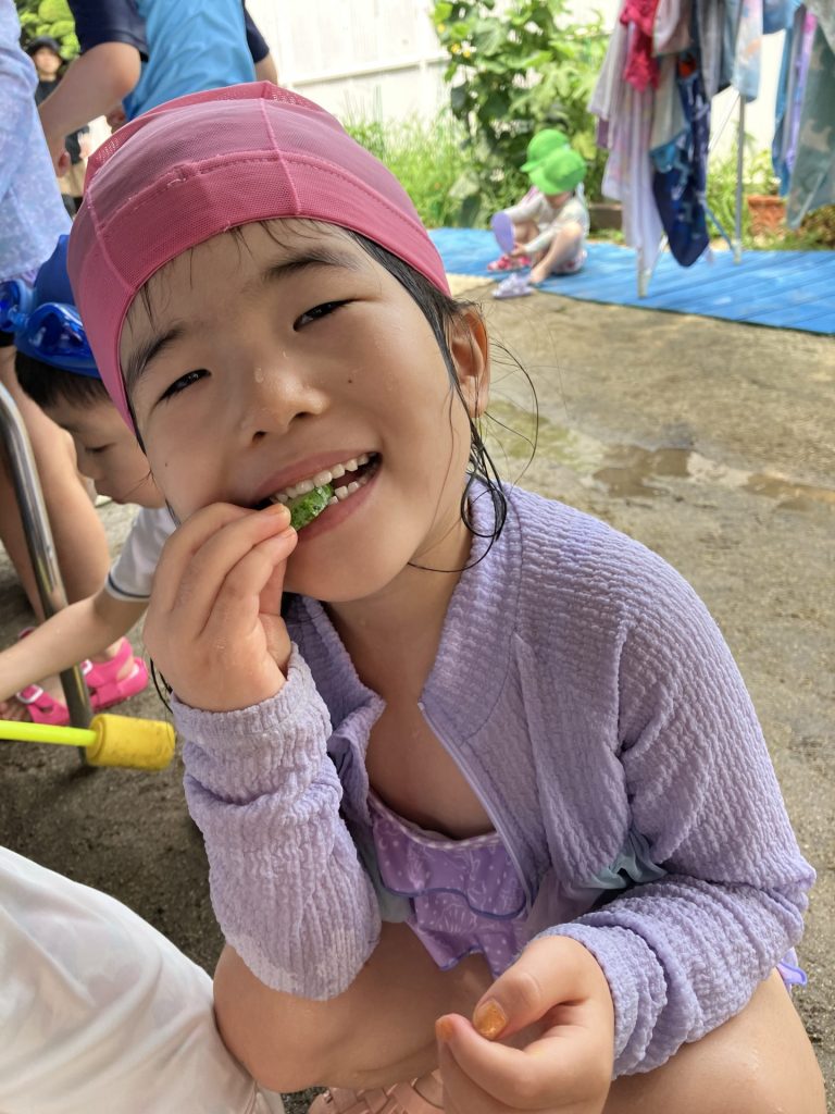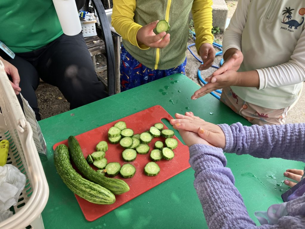 水遊びも始まり暑い中でもみんなで水を浴びて楽しんだり育てているきゅうりが毎日採れるので自分たちで切ってそのまま食べたり、少しだけ塩をまぶして食べたり。