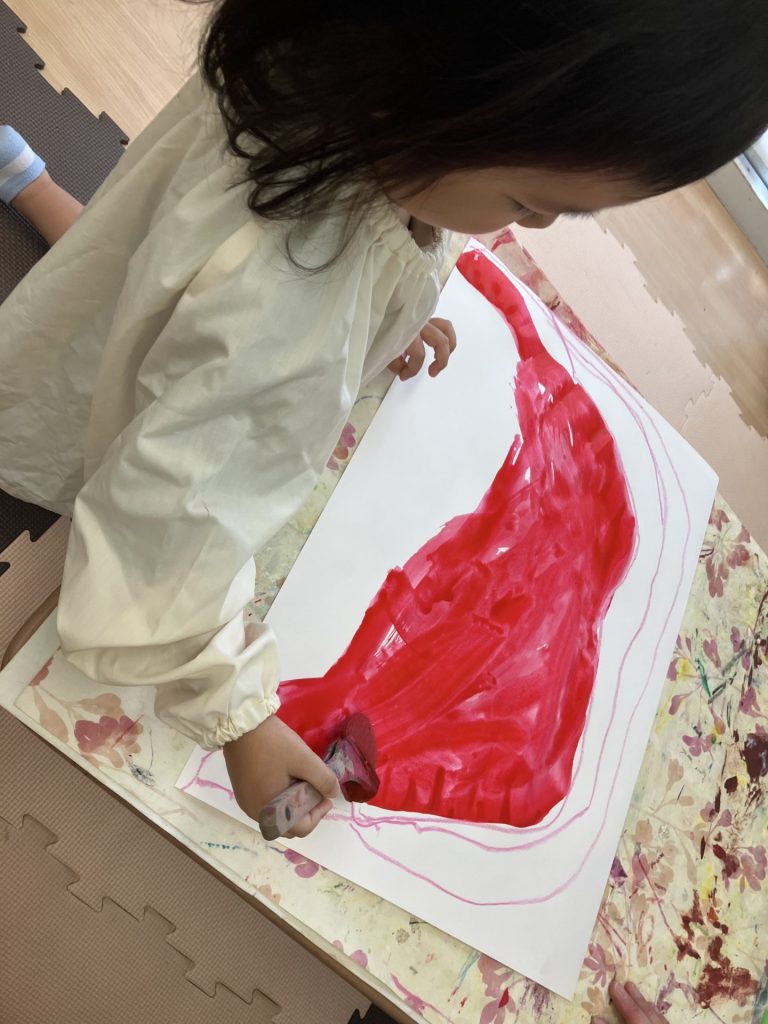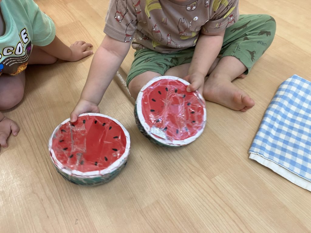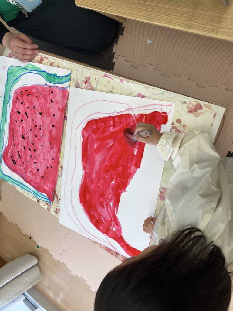 また会ではスイカ割りをしたのでその後は造形活動で大きなスイカの絵を描いたり、おもちゃのスイカを友だちと割ったりしながらみんなで楽しみました🍉