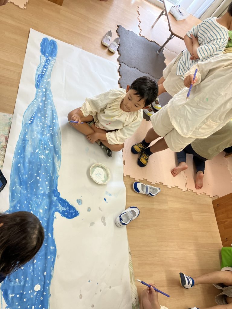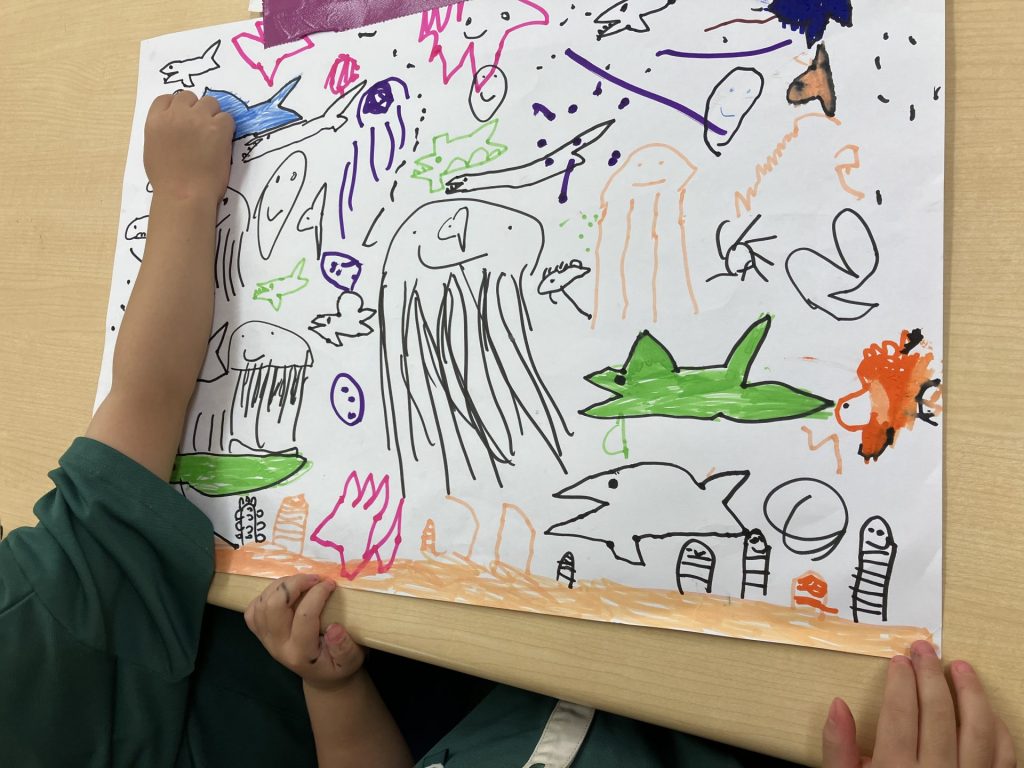 アーチの海にはたくさんの魚が泳いでいて、友だちと協力しながらジンベイザメを描いた子もいました。