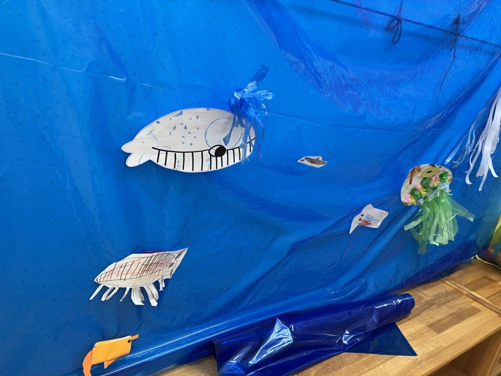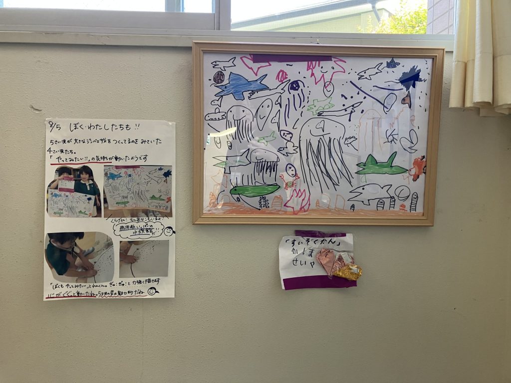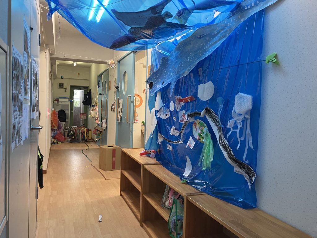 室内では水族館へ行った子の思い出の魚の絵から広がって幼児クラス廊下には大きなアーチ形の水槽が広がりました。