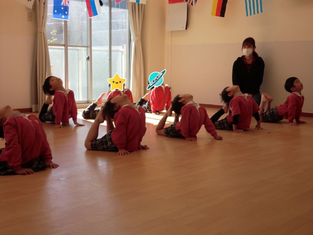 4歳児パラバルーンでは息を合わせてバルーンを動かせるようになってから技が決まるのが楽しくなってきたようでめきめきと上達し、写真でもわかるように指先まで伸ばして美しい演技を見せてくれていました。