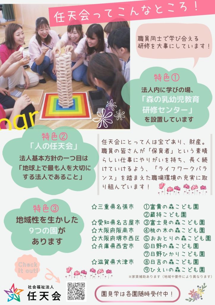 子ども、保護者、職員一人ひとりを大切にする任天会の保育や働き方について、またそれぞれの地域に根差した特徴など各園が「保育って楽しい!」「保育って素晴らしい!」と感じてもらえるように精一杯お話させていただきます!