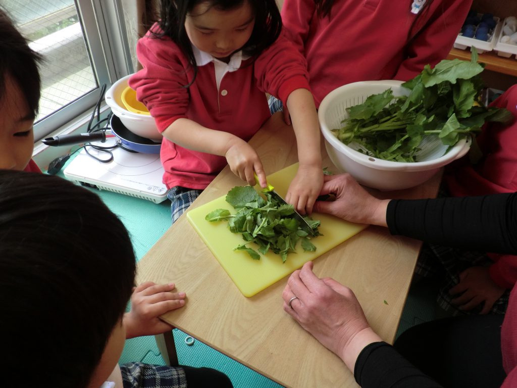 先日の5歳児課業で花壇で育てていた大根の葉っぱを調理しました。