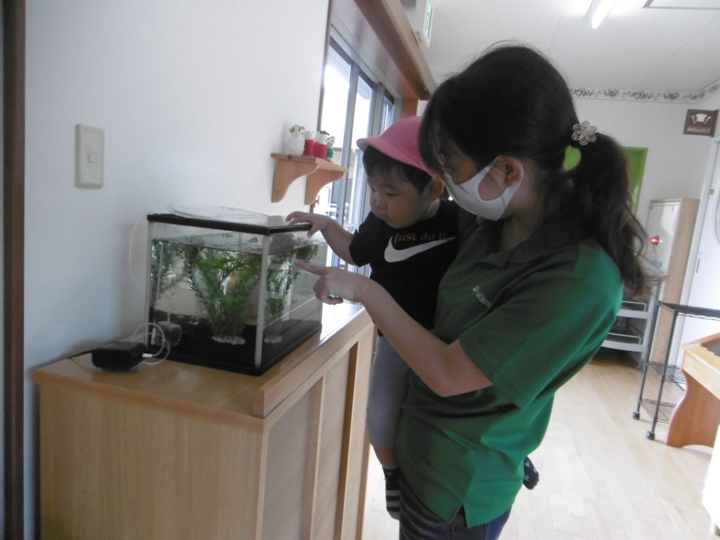 地域の方やご近所さんからメダカを頂きました。園内をお散歩中の乳児さんは、水槽を指さして「抱っこ・・・」と手を広げて、見たい気持ちを表現してくれます。