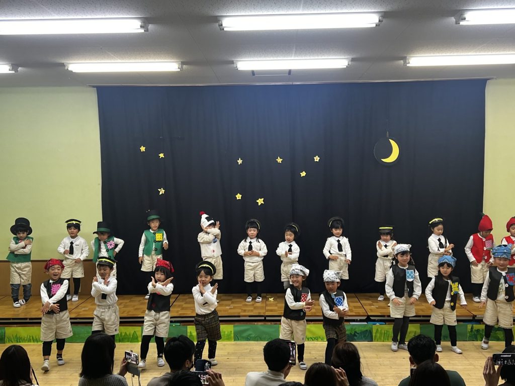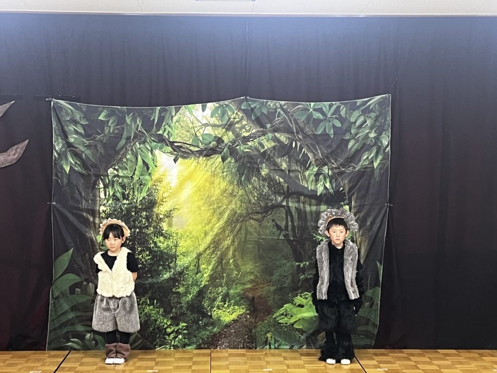 「どろぼうがっこう」この演目は、子どもたちが大好きな絵本をもとに、”泥棒先生”のもとで忍び足やお宝探しを学ぶユニークな物語です。稽古が始まった当初は「忍び足って何?」と聞いてくる子もいましたが、お友達と息を合わせ、動きや表情を工夫しながら作り上げてきました。まるで本物の泥棒学校の教室にいるかのようなかわいらしさと、頼もしさ!コミカルなやり取りに”クスッ”と笑いがこぼれました。そして、子どもたちの成長した姿に終始感動でした。