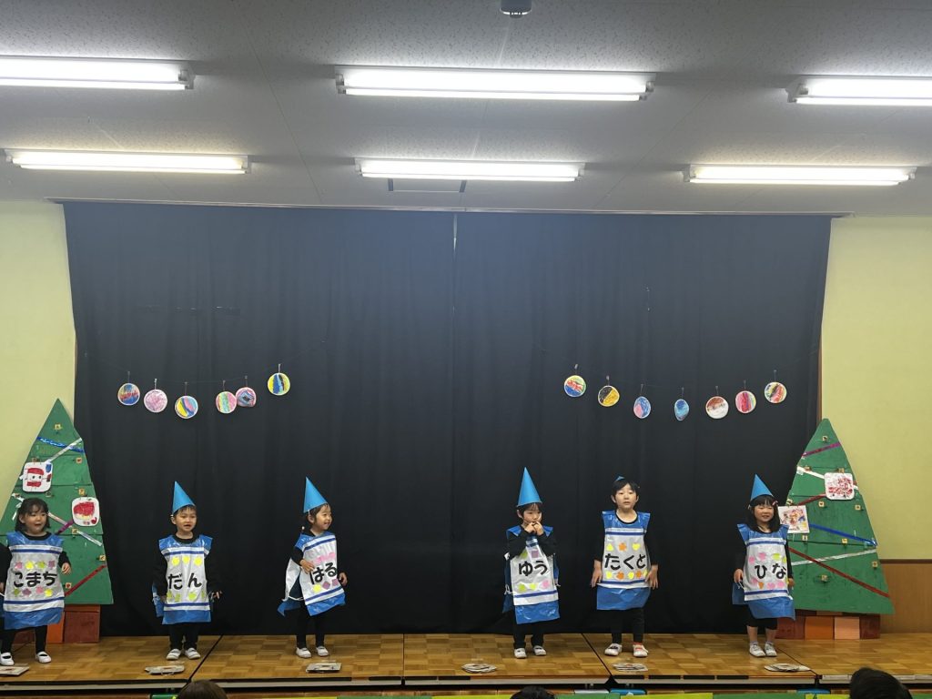 にじクラス(3歳児):劇遊び「にじくれよんのクリスマス」合奏「キミイロ」歌「せんろはつづくよどこまでも」
