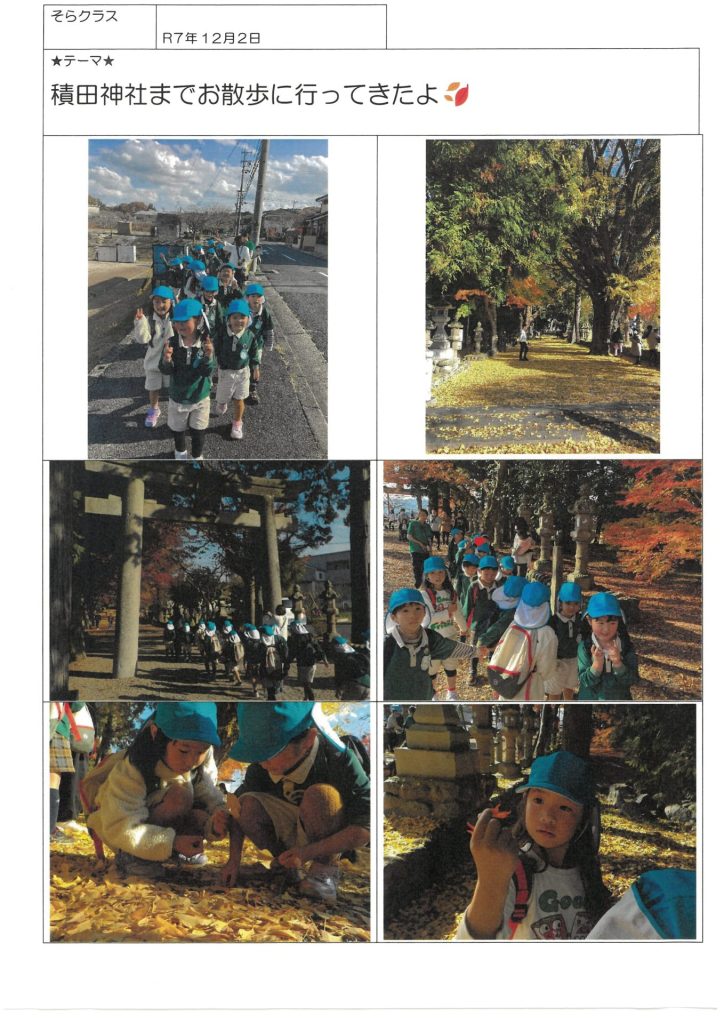 給食を済ませて、みんながお昼寝をしている時間!!!そらクラスの子たちは特別な時間です。「今日は積田神社までお散歩に行こう!!」「やったー!」子どもたちは大喜びです。(下見もバッチリ行いました)いつもに増して準備が早い子どもたちは、こども園を出発し、みんなで元気いっぱい歩き始めました。
