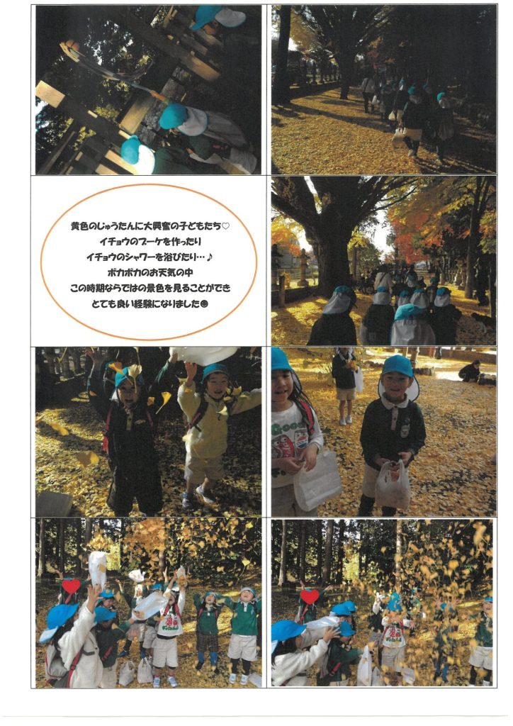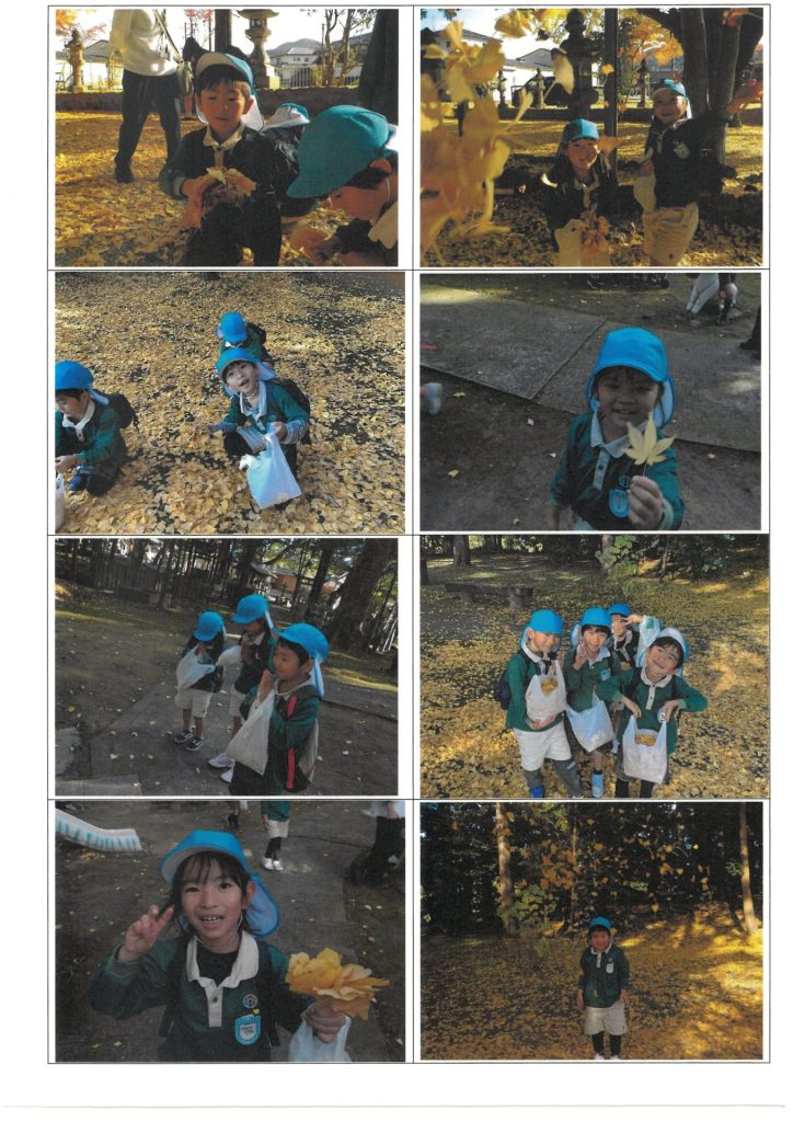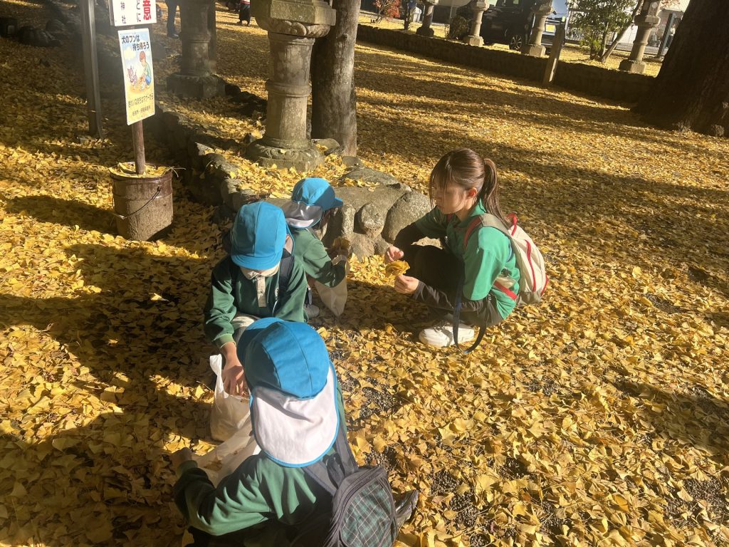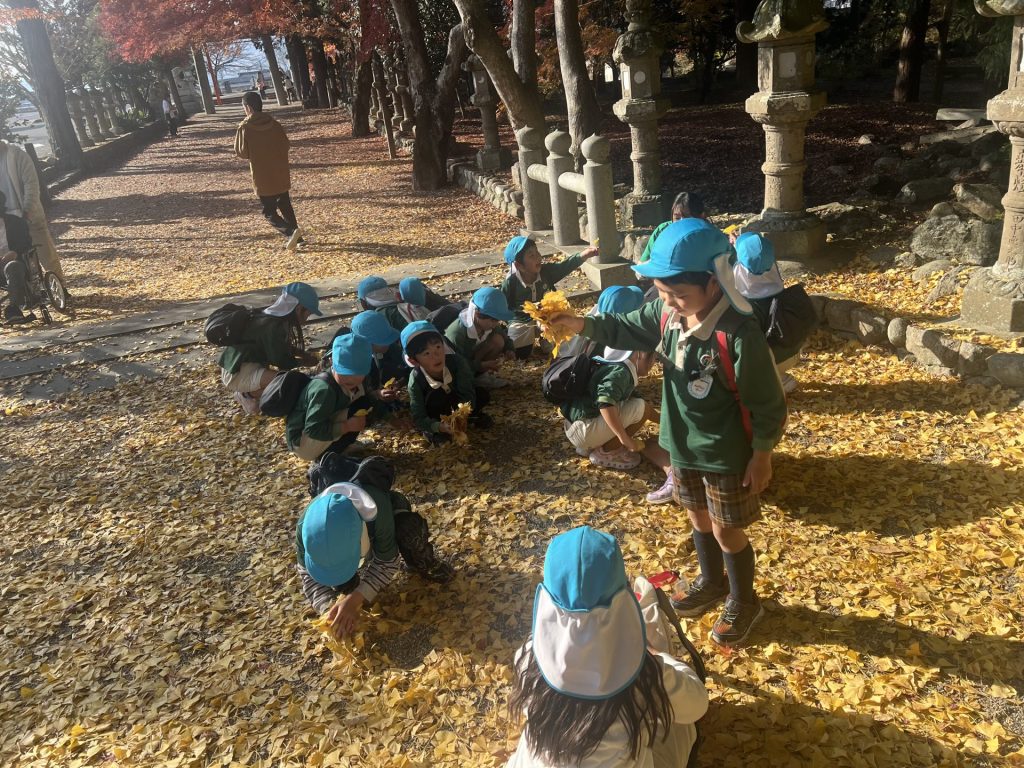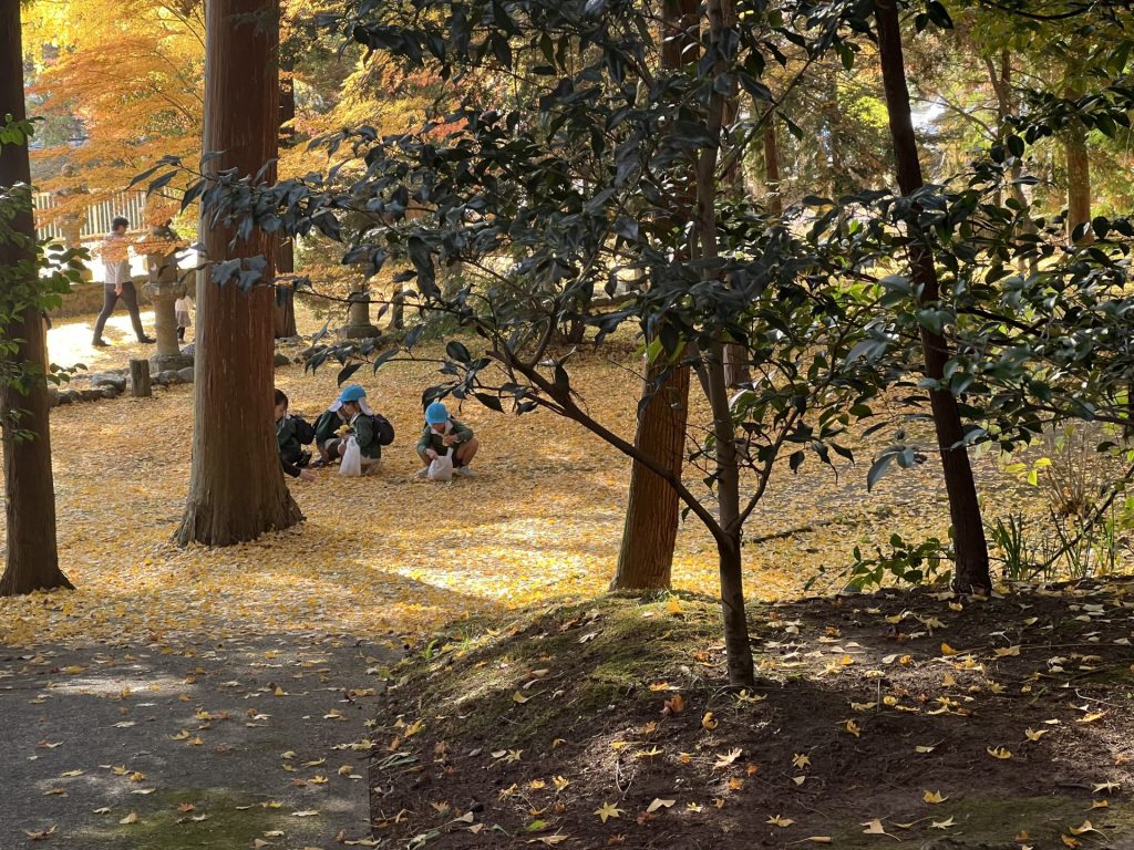 黄色いシャワーに包まれて、子どもたちは大はしゃぎ。葉っぱをすくい集めたり、空に向かって投げたりして、楽しいひとときを過ごしました🍂