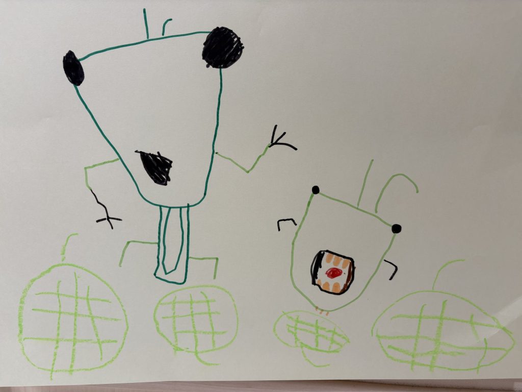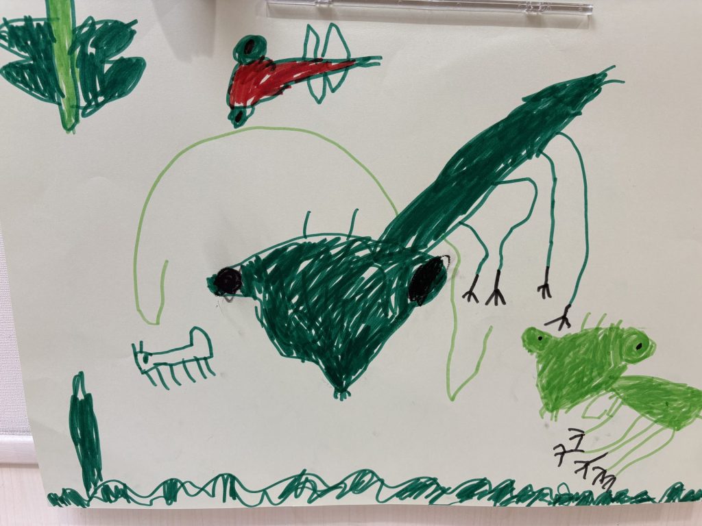 豊かな表現でカマキリを描く姿は、めちゃくちゃ真剣です。