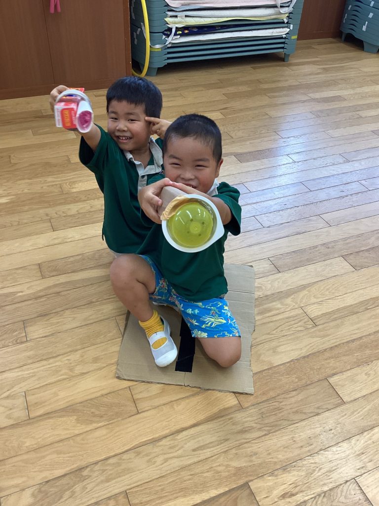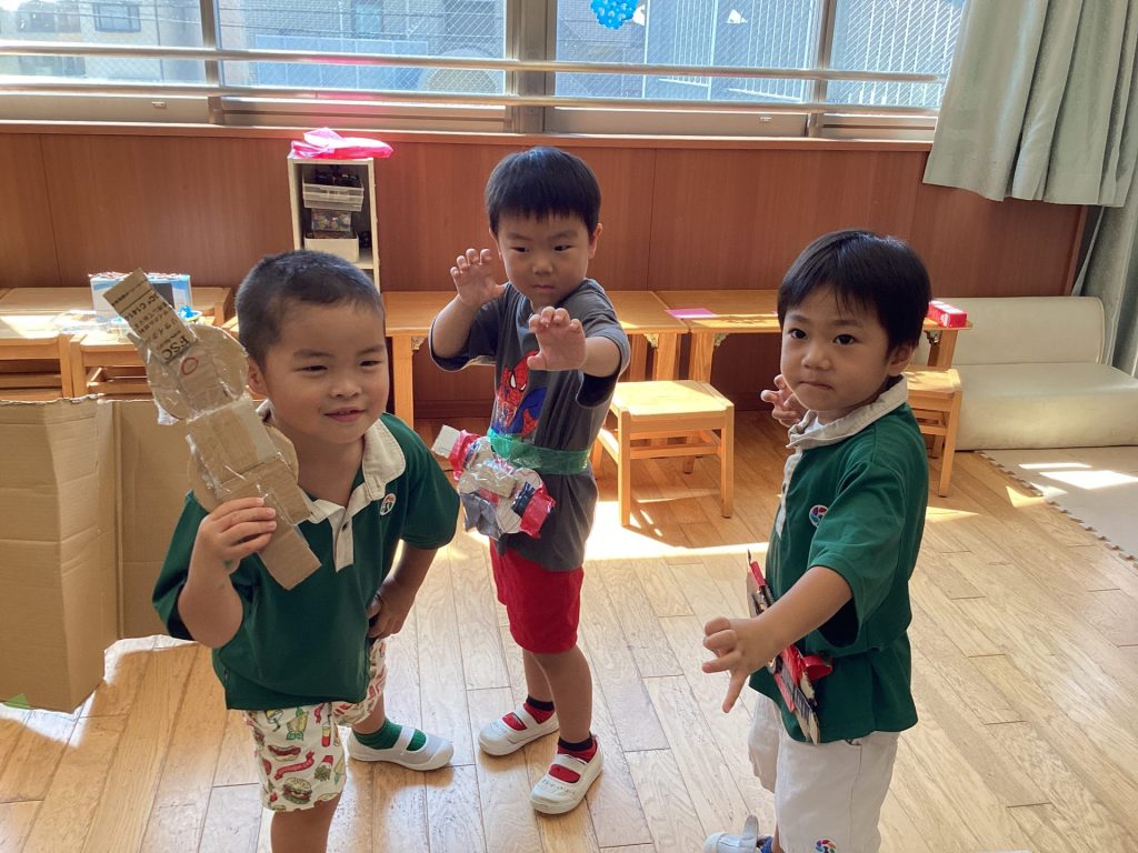 大好きなヒーローになりきるために、変身グッズ、武器、盾、いろんなものを造形の部屋に置いてある段ボール、プリンカップ、生活材を駆使して作り上げ、色ガムテープやマジックを使って仕上げていきます。