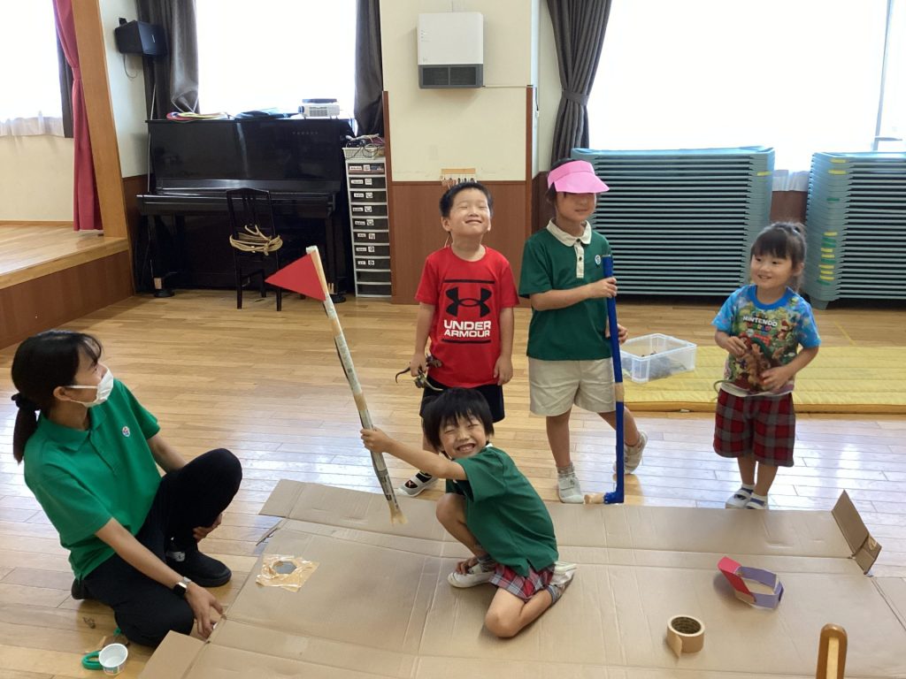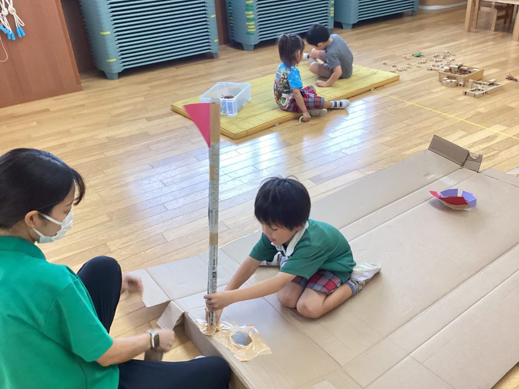KY君は「床に穴が開いていて、そこにボールが入るんだよ」と教えてくれました。床に穴は空けられないので、K君と保育者はパットゴルフになるように大きな段ボールを探してきてプリンカップでボールが入る穴を作りました。