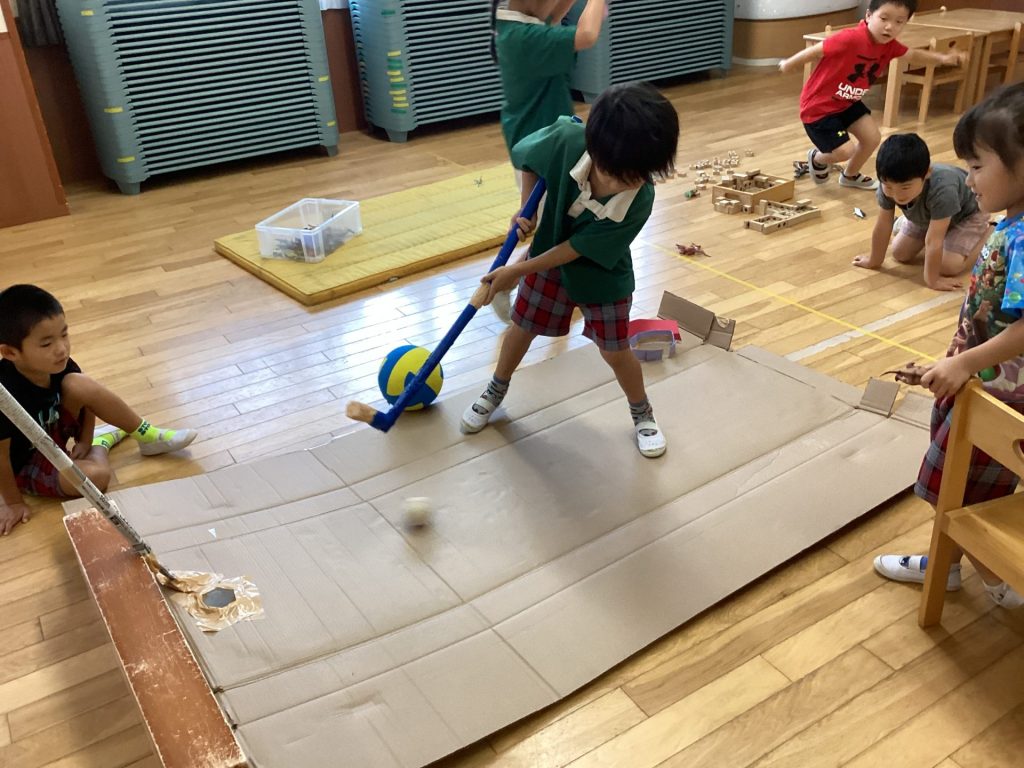 「ゴルフ」というワードを通してそれぞれの子どもが知っている知識を駆使し、遊びを作り上げていける年長児です。