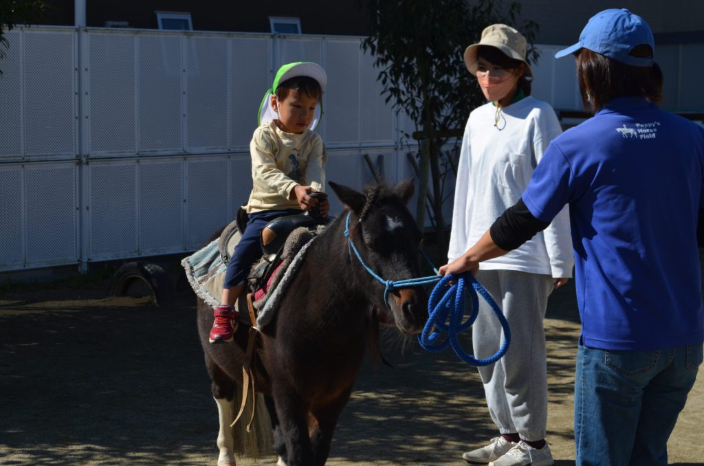 2~5歳児の子ども達が馬に乗せてもらい、年長児はエサやりも体験しました。