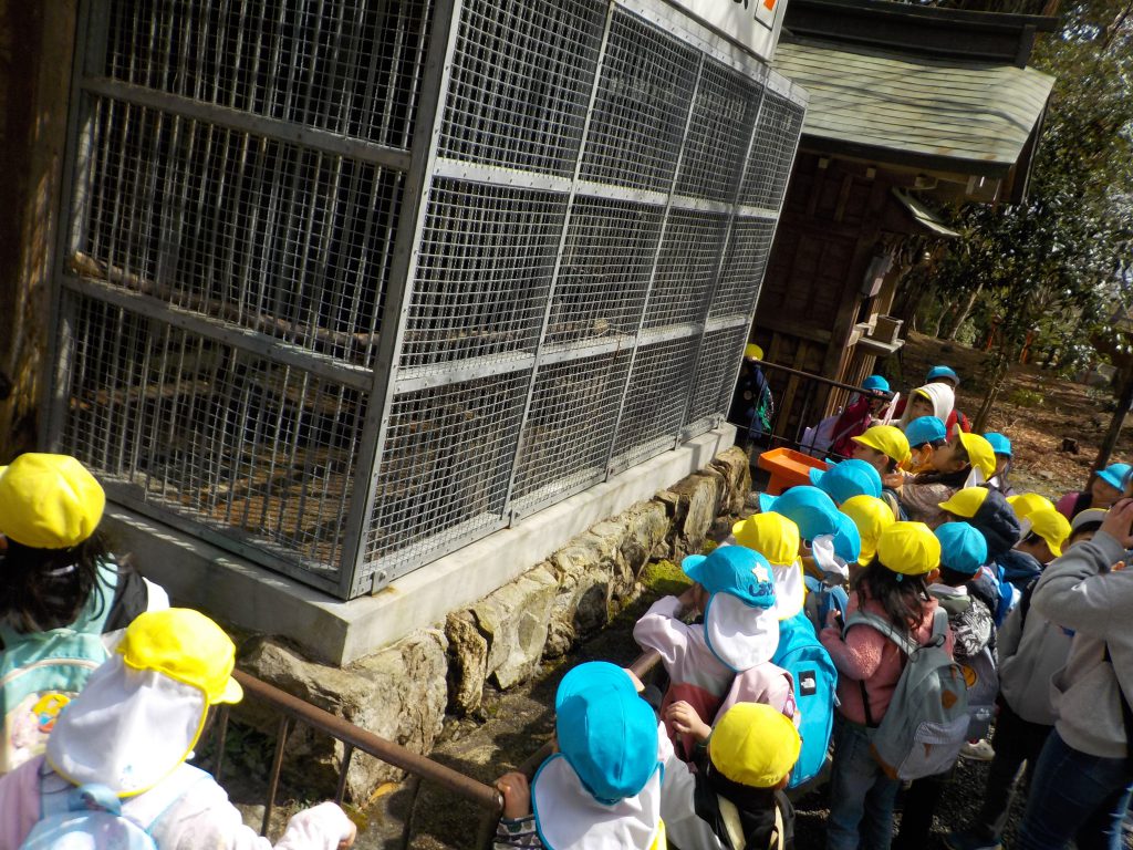 まずは近所の日吉大社まで、神のサルである”まさるくん”を見に行きました。厳重な警備で中のお猿さんが見にくい…でも子ども達は10分以上興味深げにまさるくんを見学していました。たまに”しゃ!”と怒らせてしまいましたが…ごめんねまさるくん。