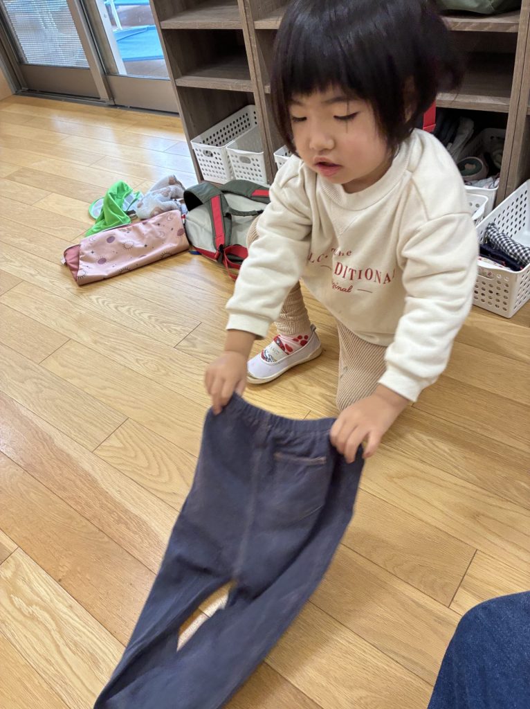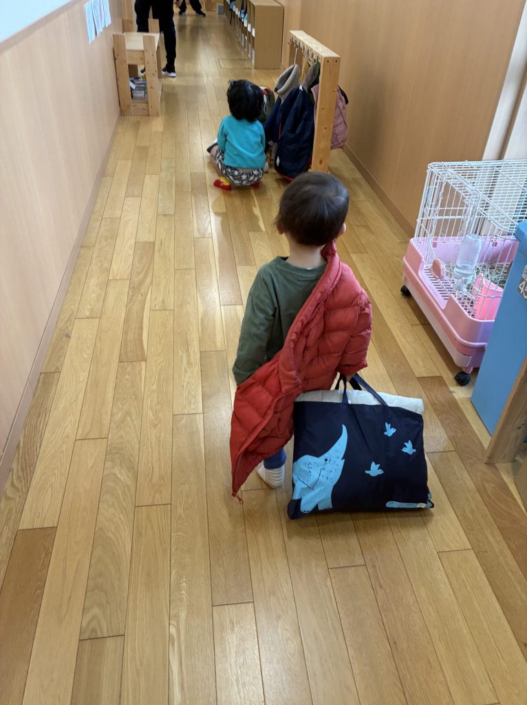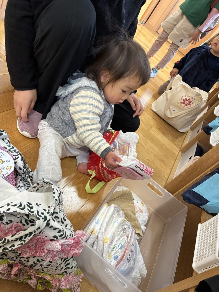 初日から子どもたちの美しい生活の光景がいくつも見れました。0歳児クラスの子が時間をかけながら自分のロッカーへ向かい自分の力で支度をする姿。2歳児の子が自分の衣服を丁寧にたたむ姿。3歳児の子が助け合いながら支度をする姿。その一つ一つの姿を保育者全員で喜び愛でて褒め合う時間。どれも美しかったです。子ども達は自立のその先にどんなことが待っているのか分かっているのだと思います。