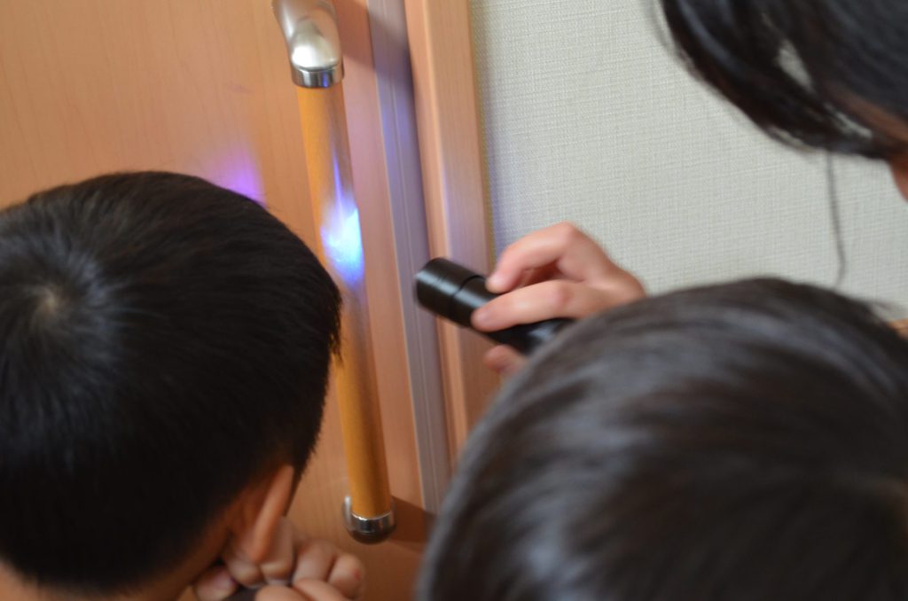 手洗いチェッカーを用いてどれぐらい汚れがついているのか、部屋のどの場所に汚れが付きやすいのかブラックライトをあてながら部屋の隅々を見て回りました。
