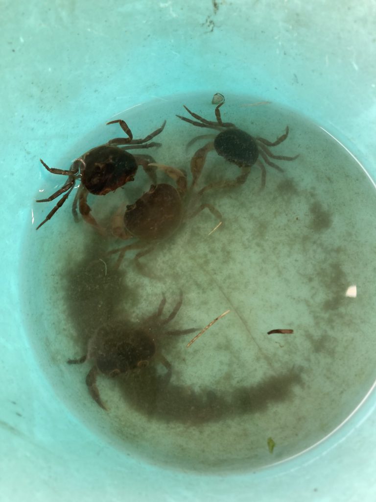 園庭で遊んでいる子どもたちと保育者にお隣さんから声がかかりました。田んぼでお世話になっているだけでなく、畑のジャガイモをひきにおいで~と誘っていただきました。それだけでなく、畑や田んぼにはそこかしこに水路があり、生き物がたくさん!一緒に捕まえて遊んでもらいました。