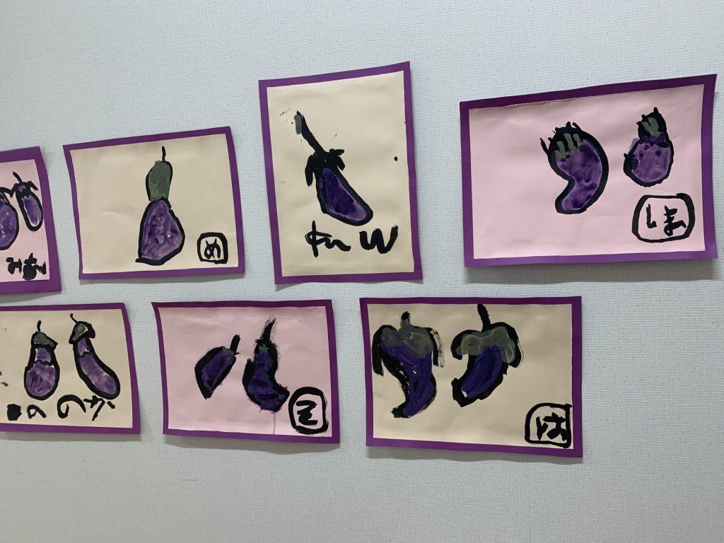 秋ナスの収穫からの描画活動、ハラビロカマキリのお腹から出てくるハリガネムシ、ブロッコリーの葉を食い尽くしたモンシロチョウの幼虫たち、鮮やかに色好き制作意欲を刺激する千日紅。