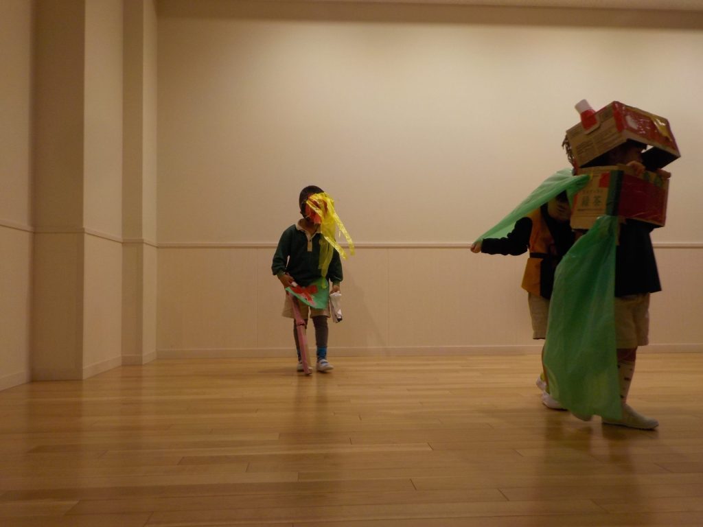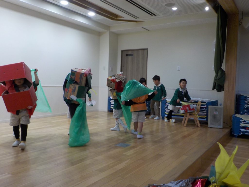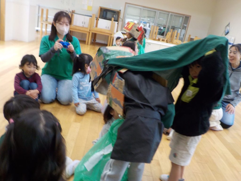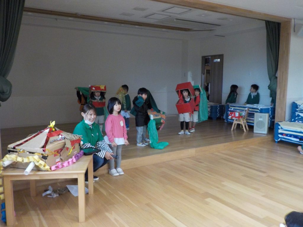 みんなにみて欲しい!という思いから始まり、天狗もいるな、2人組で踊るんよな、太鼓もいるで、とイメージは膨らんでいきました。クラスのサークルタイムの時間にも話題にしてクラス全体が取り組む遊びとなっていきました。