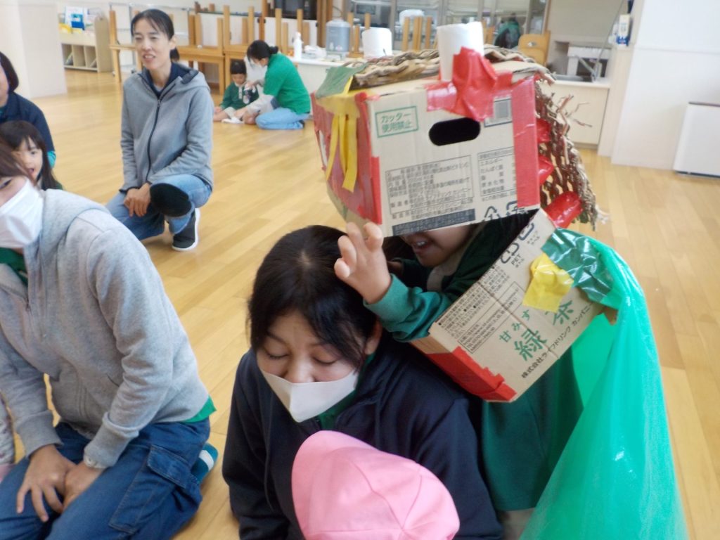 当日は、登園の時からワクワク・ドキドキ、「今日やな!」とキリっとした気持ちの4歳児。手作りの神輿を担いで園内を練り歩き、ホールでは獅子舞を披露したくさんのお客さんに観てもらいました。頭をパクパクと噛んでもらう演出は、もちろん自分かやってもらった経験から生まれています。