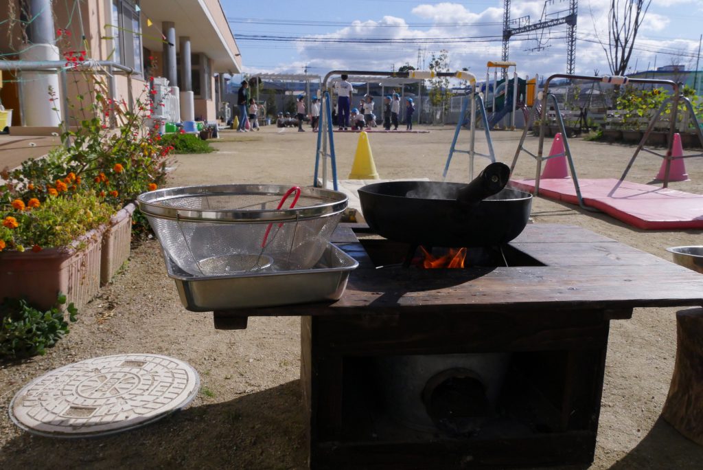 園長は園庭の隅っこで料理をしています。