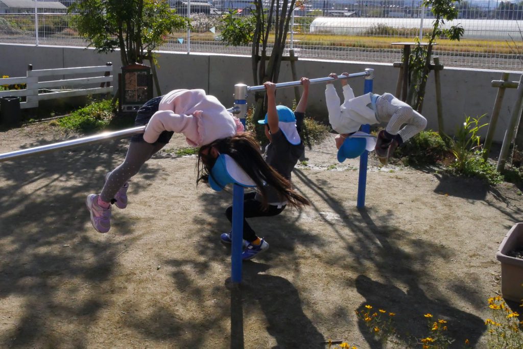 5歳児たちがボール遊びや縄跳び、鉄棒を楽しくとりくんでいるのを見ながら、