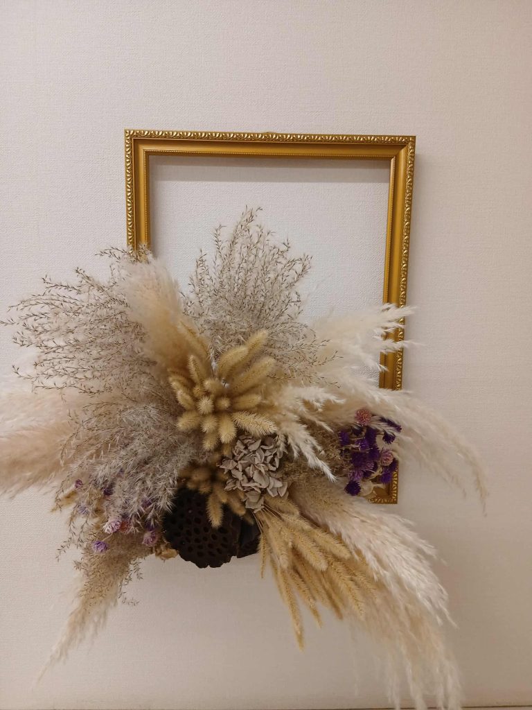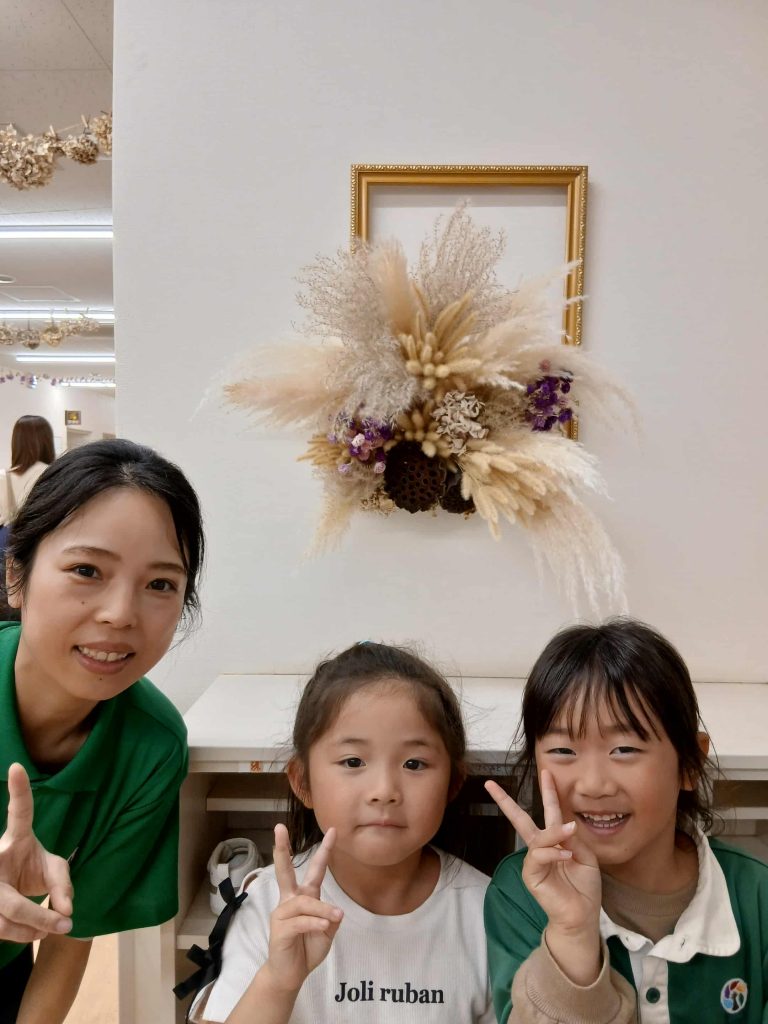 今年度より、やりたい子だけでフラワーアレンジメントが得意な職員と園でゲットした自然物で飾りを作成しています。