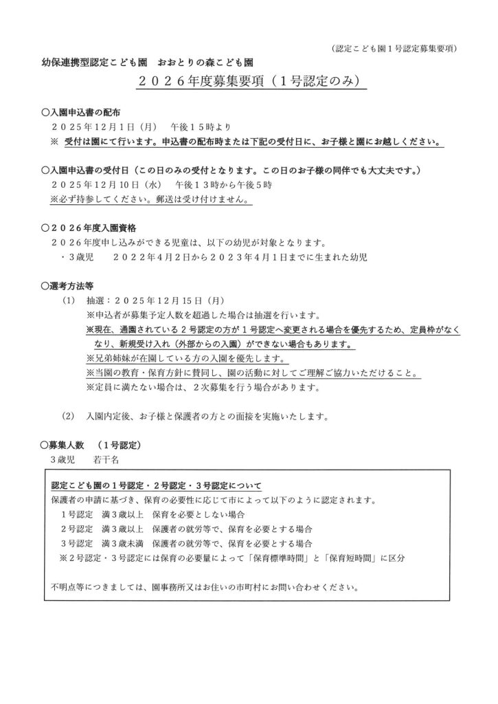 ※現在、通園されている2号認定の方が1号認定へ変更される場合を優先するため、定員枠がなくなり、新規受け入れ(外部からの入園)ができない場合もあります。